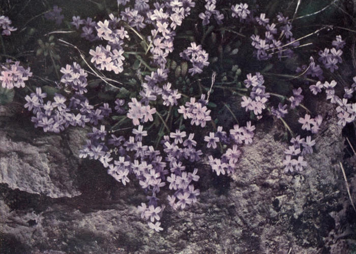 The coloured plates of Alpine plants, which are the special feature of this book, are all reproduced from colour photographs taken directly from nature. The plants were all photographed exactly as they were found, with two exceptions, in the immediate neighbourhood of Rosenlaui in the Bernese Oberland during the month of July 1909; so that the pictures are true portraits of the flowers “at home.”