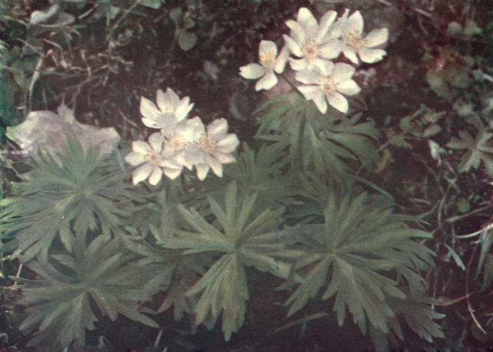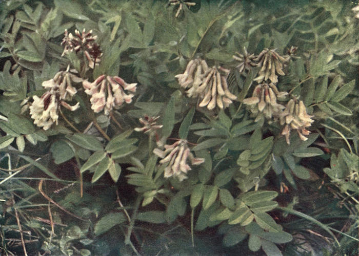 The Narcissus-flowered Anemone, here photographed, is a widely distributed plant. It occurs on grassy slopes and in pastures between 4000 and 7000 feet above the sea level, and seems to prefer a limestone soil. The finely divided leaves are well seen in the photograph. Unlike every other species of Anemone found in Switzerland the flower stalk bears not a single flower only but two to eight, or even more, and at the point where the flower stalk divides a green collaret or involucre is seen. The flowers are pure white inside, and their external surfaces are often slightly woolly and tinged with pink, especially in the bud. The seeds have no feathery appendages like those of the Alpine Anemone. The flowers are without honey. They are visited by pollen-collecting insects, and should these fail will become[3] self-fertilised. The plant blooms in May and June, and some flowers may still be found even in July in the highest Alpine pastures. It is met with widely distributed over Central Europe, North America and Northern Asia, but is absent in Scandinavia. On account of the numerous closely allied species which are found in Northern Asia, it is thought that this plant may have originated in that region and then spread east and west to America and Europe respectively.