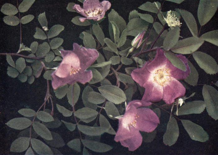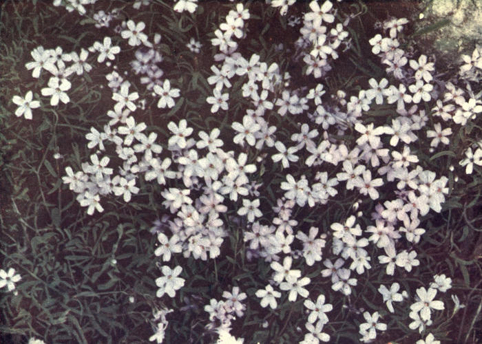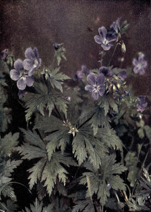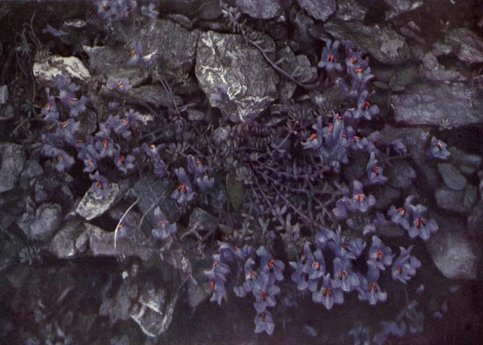 It is impossible in such a book as this to give more than a few general suggestions as to the photography of Alpine plants. One of the chief difficulties with which one has to contend is the wind. When the plant is photographed anywhere near its natural size the smallest stop has to be used to obtain depth of focus, and this greatly increases the duration of the exposure. Many of the colour photographs herein reproduced were given as long as five or ten minutes. When the wind is intermittent it is quite safe to[xxvi] give repeated exposures of a few seconds at a time, being careful in removing and replacing the cap not to shake the camera, for the plant is sure to return to exactly the same position after being blown to and fro by the wind. Where tall plants are being taken it is wisest to select a time in the early morning or near sunset, for though the intensity of light is diminished at these times, there is usually but little wind. The writer has found a strip of white calico, some 12 or 15 inches wide, with long knitting needles sewn on to it at intervals, of great value as a wind screen in plant photography. The knitting needles can be pushed into the ground, and the plant surrounded on three sides or completely by such a screen, and thus very largely shaded from the wind. With a little care the screen does not appear in the photograph, and it is easily rolled up and carried from place to place. For near objects the intensity of light in the Alps is only slightly greater than that in England at the same time of day, but it is always wiser to make use of an exposure meter if the best results are desired. By the use of the swing back any plane surface, whatever be its inclination to the vertical, can be easily focussed. This will be found of especial value where a blurred background is desired, and the slight distortion thus obtained, which is so noticeable in architectural subjects, is quite negligible in the case of plant portraits. The deep shadows that are produced when flowers are photographed in bright sunlight are generally best avoided.