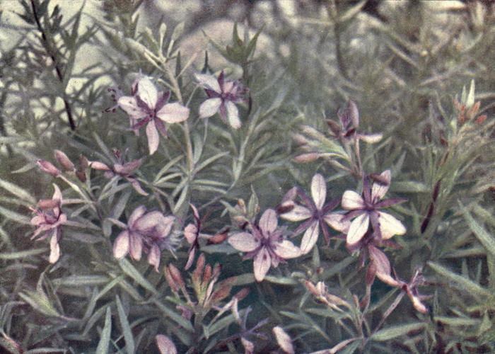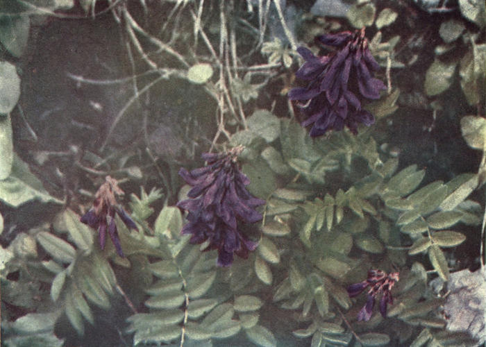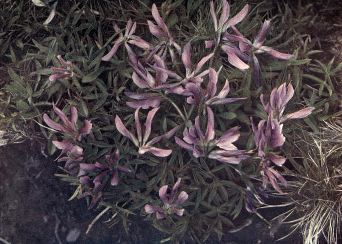 From the root stock arise one or more prostrate branches which creep over the rocks and soil, and turn upward at their extremities to terminate in a bunch of the brightly-coloured flowers. The grey-green leaves are narrow and succulent, and are arranged in whorls of four on the stem. The flowers are furnished with a long spur which contains the honey,[67] and are only visited by bees and humble-bees. The common humble-bee has a long enough tongue to reach to the tip of the spur and is the chief agent in the fertilisation of the plant. The orange-yellow spot at the only opening to the flower is equivalent to a notice “this way to the honey.” Should no insect visit a flower self-fertilisation will nevertheless occur and seeds will be produced all the same. A variety of this plant, with flowers of a uniform red-violet colour and without any orange-yellow spot, grows on primary granitic rock. A second and much rarer type has pure yellow blossoms.