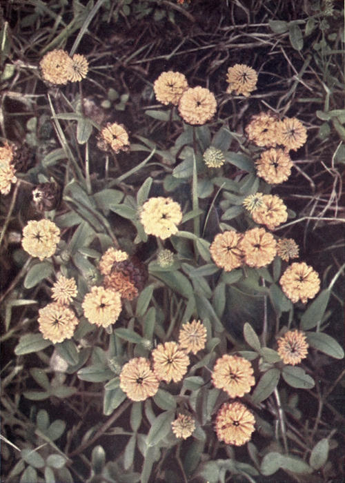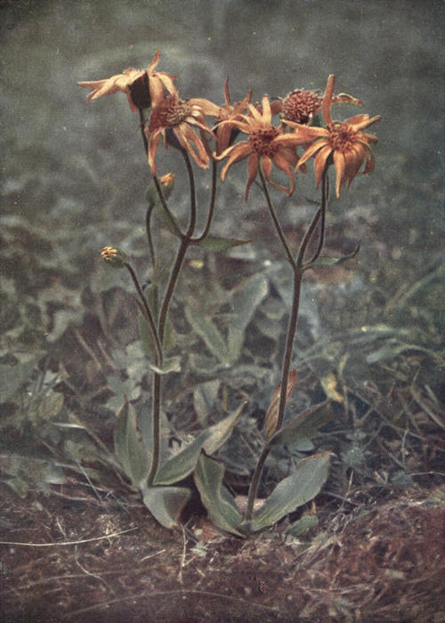 A bright conspicuous plant is the Arnica, with its yellow star-like flower-heads. It grows in meadows, pastures, and on sunny moors, and is widely distributed in the Alps, from the lower mountain regions up to 8000 feet. It is much less common in limestone than in other districts. Four broad green leaves grow from the root in the form of a cross. In the centre of these rises the erect flower-stalk some 8 or 9 inches long, and covered with glandular hairs. On the flower-stalk are borne the one or two pairs of leaves, without stalks, and arranged opposite to one another. The flower-heads are drooping in the bud, but when they open they are large and conspicuous and of a deep yellow colour. They give forth a faint, resinous, not very pleasing, odour. The outer or ray florets of the flower-head have long projecting strap-shaped petals. Their purpose is to attract insects to the floral society, and the less conspicuous florets in the centre of the flower-head produce just as good seeds. At first but a single flower-head is formed, but later on, if the plant is vigorous, buds appear in the axils of the opposite stem-leaves, and two more flower-heads appear. This is what has happened in the two specimens here photographed, and a second pair of buds is seen in one of them. It is interesting to note that a mould-like fungus is found constantly[49] associated with the roots of the plant. It is believed that the two plants grow together to the mutual advantage of each, the fungus assisting the Arnica to obtain nourishment from the soil, and in return receiving from it some of the organic matter manufactured from the air with the help of light. The root has a bitter aromatic taste. From it is made the tincture of Arnica, which is often applied to bruises, apparently, however, without any very considerable influence upon them.