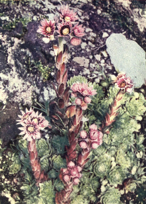 The cultivation of Alpine plants in our gardens at home is by no means as easy as might at first be supposed. The climate and conditions of life in Peckham are very different to those at the summit of Pilatus, and unless the thing is done carefully and thoroughly it had better not be attempted at all. The chief difficulty in growing Alpine plants in our climate is not the cold but the excessive moisture of winter, which tends to rot their roots, and from which they are protected in their native home by their snowy covering. Our object should be to reproduce, as far as possible, in our gardens the conditions under which the plants grow in the high Alps. For the rockery a porous stone will be required, such as limestone or sandstone, and it is essential to select a kind that does not crumble with the frost. The partially fused masses of brick, which can be obtained very cheaply as a waste product from brick kilns, when washed over with a mixture of cement and sand do very[xxv] well. The rocks and stones must be so laid that every bed or pocket in which the plants are to grow is thoroughly well drained, for nothing is so destructive to them as water-logging of the soil. Plants that grow in the clefts of rocks should be planted in a sloping position, as water is then less liable to collect in the rosettes of leaves. Those that grow in cool, moist, spongy soil are best planted in a mixture of peat moss and earth. It is also important to notice whether the plant which is being cultivated was previously growing on limestone or granitic soil, for it is easy to add a little chalk to the earth if this is required. In planting out one has to be careful not to curl up the roots, and it is wise to sprinkle the plant with water two or three times a day for the first week or so. Alpine plants should never be manured. It should be remembered that mountain plants grow slowly, and though very many species can be successfully cultivated, the Houseleeks and Saxifrages are likely to give the best results with a minimum of trouble.