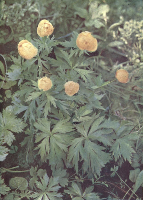 THIS large and stately plant is common in mountain pastures from the lower levels right up to 7000 feet. It has finely divided leaves and bright yellow globe-like flowers, borne on long stalks which are usually unbranched. It is evidently a near relation of the buttercups, but differs from them in the possession of numerous brightly-coloured sepals, which enclose and conceal the much smaller tongue-shaped petals. Although not exclusively Alpine, being found all over Central Europe, in Scandinavia, and the north of England, it has been included in this series because it is sure to be noticed by anyone visiting Switzerland for the first time.