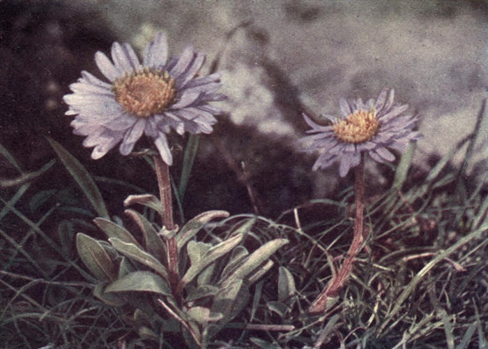 The beautiful little Alpine Aster is found all over the Alps. It flowers in July, August, and September, but occasionally it may be found in bloom even as early as May. It grows in dry Alpine pastures, sunny meadows, and rocky places, not infrequently in company with the Edelweiss, between 4000 and 9000 feet; in a few places it extends much lower. The plant consists of a rosette of woolly tufted leaves, with a central stem bearing the solitary flower-head. In the higher regions the flower-stem is short, perhaps only 4 inches in length, but nearer the plains it may be 8 or 9 inches. In any case, however, the flower-head is large, an inch or two in diameter, and conspicuous on account of the broad purple ray florets, which contrast strongly with the golden yellow centre. The Alpine Aster is very widely distributed, being found in Northern Asia, Arctic America, and in most of the mountain ranges of Central and Southern Europe, but not in the far North.