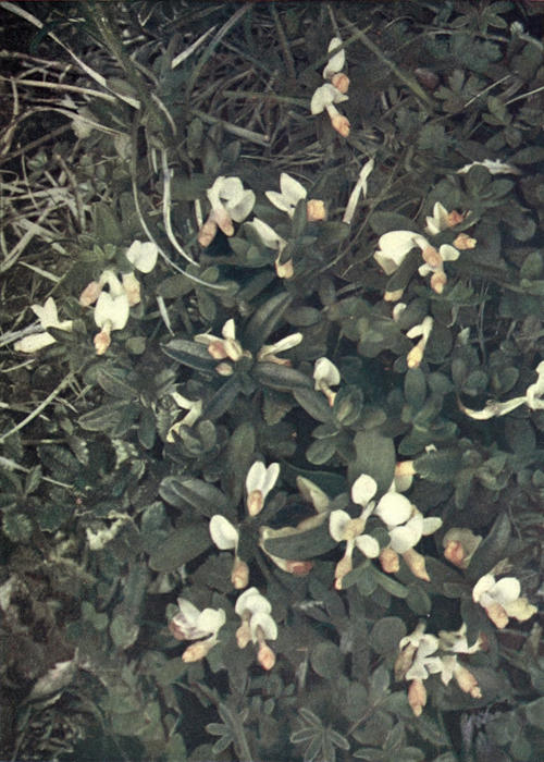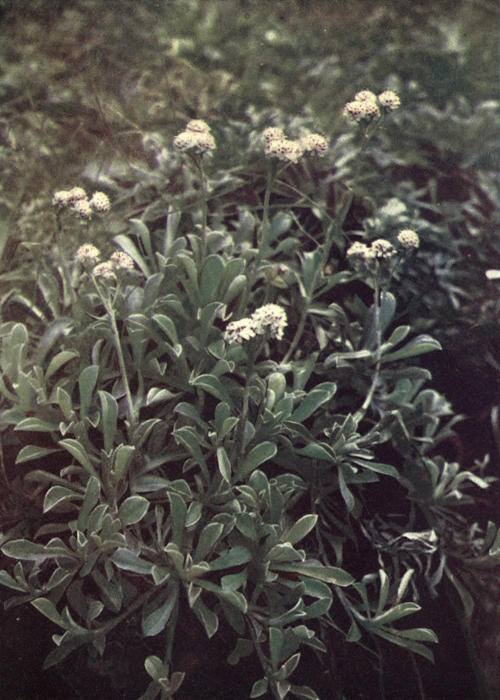 The Cat’s-foot, which is, after all, perhaps the most suitable name for this curious plant, is abundant in the Alps from the lowest levels right up to 7000 or 8000 feet. It is found in dry places, on moors and heaths, and in dry open woods. It sometimes forms an unwished-for inhabitant of the mountain pastures where it is disliked by the herdsmen, for it is an undesirable plant for fodder. The leaves, like those of the Edelweiss, are covered with white woolly hairs, and the flower stems are also hairy. The flowers, which are pink or white, are dioicious, that is to say, the same flower does not produce both pollen and seed, and seed-forming and pollen-producing flowers do not occur on the same plant. As the pollen is not carried by the wind from flower to flower, the plant is entirely dependent upon its insect visitors for the fertilisation of its seeds, and without them no seeds will be formed. The plant is also spread by means of runners, which extend over the soil and take root at intervals. The Swiss peasants make wreaths of the Mountain Everlasting, which they wear as a charm, especially on Ascension Day. The plant is widely distributed, and is found in the North of England and Scotland, as well as most parts of Europe and the Polar regions.