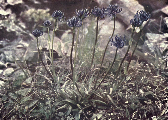 In England we have only two kinds of Rampion and both are rare, but in Switzerland there are no less than ten different species, with blue and white flowers, and some of them are extremely abundant. One of the commonest of the blue-flowered varieties is here photographed. It grows in mountain pastures and poor meadows between 3000 and 8000 feet, and is found not only in the Alps but all over Central Europe, though absent in the North. It flowers in July, and the size of the plant undergoes considerable variation according to the altitude at which it grows. Sometimes the flower-stalks are but 3 or 4 inches long, at others 16 or 18. The leaves, which grow from the root stock, have serrated edges, and are frequently a good deal larger than those of the specimen photographed. The methods adopted by the plant for the distribution of its pollen and the fertilisation of its seeds through the agency of insect visitors are of particular interest. Each flower of the flower-head is formed of a blue tubular structure (corolla), which is at first closed above. In the centre of this is the style covered by short hairs and surrounded by the five stamens. While still in the bud the stamens shed their pollen, which collects in the tube around the style and is retained in position by the short hairs. Now the flower opens at its tip, and while[53] maintaining its tubular character above splits longitudinally below into five or six segments, so that linear openings are formed. The result is that when an insect settles on the flower the tubular corolla is very easily depressed, exposing the style surrounded on all sides by pollen. Any pollen that is not removed by the insect falls from the style, for the short hairs on the style by which it is held in position very soon fade. The style then splits above into three segments, exposing for the first time the sticky stigmatic surface now ready for pollination.