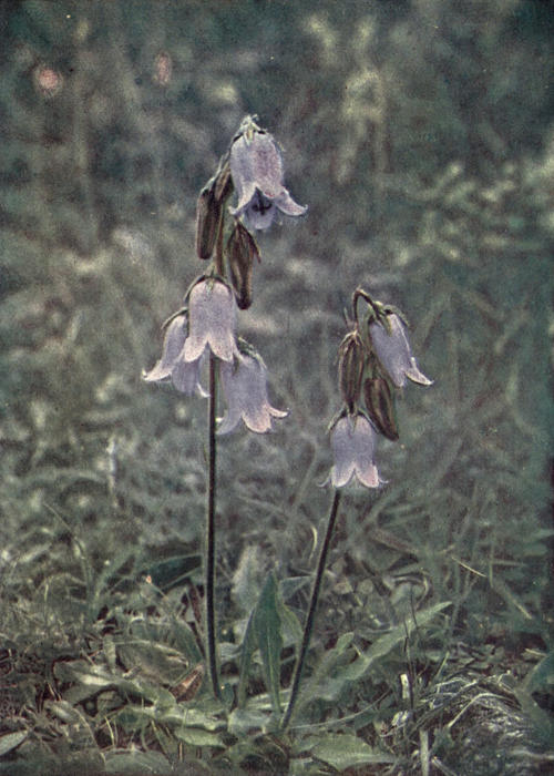 Of the numerous Bell-flowers which abound in the Alps none is more quaint and beautiful than the one here photographed. The whole plant, stem, leaves, and flowers, is covered with short hairs, but around the mouth of the bell the hairs are longer and stiffer, and pure white. It is interesting to note that when cultivated in rockeries in England the hairy character of the plant almost entirely disappears. Some three to five pendent flowers are borne by each flower-stalk, all turned in the same direction. Occasionally a single flowered variety is met with, usually at a high altitude. The ordinary pale blue colour of the flower may disappear entirely, and specimens with pure white blossoms are not infrequent. The plant is found abundantly all over the Alps and Sub-Alps, in meadows and pastures, and to a less extent in open woods, from 3000 feet almost to the snowline (7000 to 9000 feet). It is usually less abundant on limestone than on other rocks. The Bearded Bell-flower is also met with in the Carpathians, Jura, southern parts of Norway, and in other mountainous districts in Europe. It is probably a native of the Alps.
