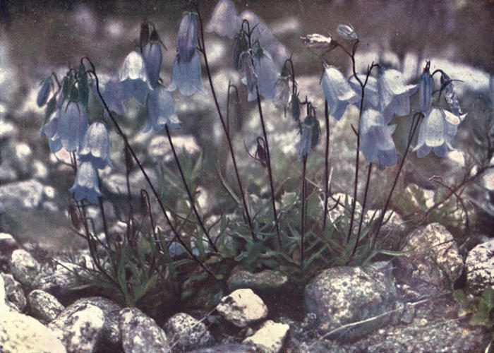 The photograph gives a good general idea of the tufted growth of the Dwarf Bell-flower. The plant is quite small, rarely more than 3 or 4 inches high, and forms dense close-growing tufts of some size. The smooth or hairy flower-stalks bear one to six pale blue flowers and the narrow leaves, which are most numerous and have serrated edges below. There are also short flowerless branches covered with similar leaves, and a few broader leaves with longer stalks grow directly from the root stock. These last are not well seen in the photograph. The plant is very abundant in dry rocky and sandy places, in dried up torrent-beds, by the roadside and on the tops of walls. It is found from the lower mountain region up to some 8000 feet, and descends with some of the rivers towards the plains. It is also found in the Jura and parts of the Black Forest.