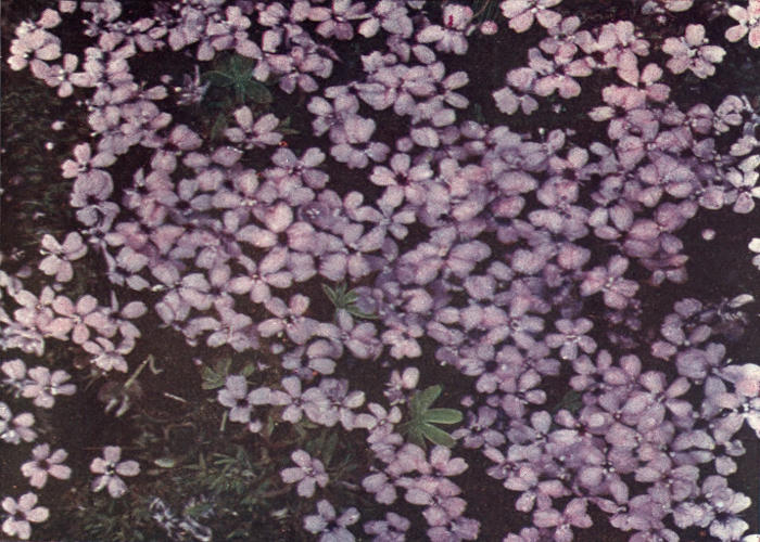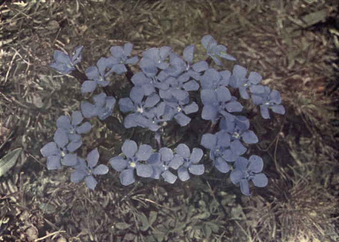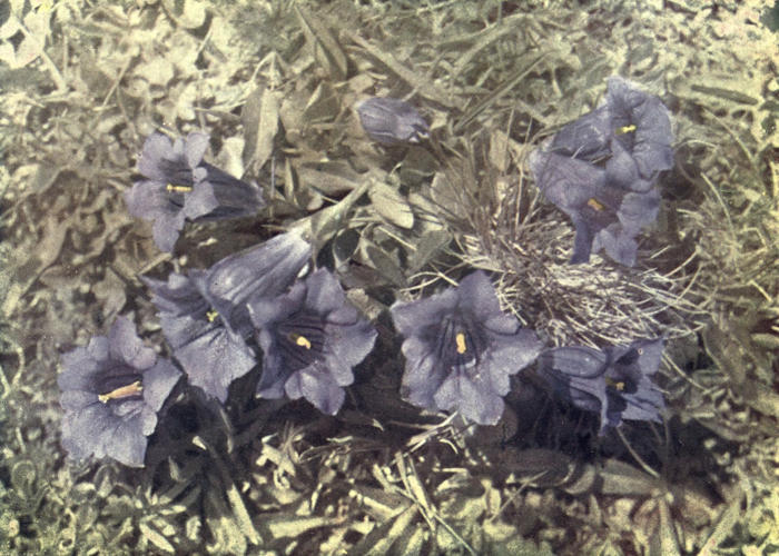 A particularly fine group of this beautiful little Gentian is here photographed. It is typical of the high Alps or snow region, and is rarely found below 6000 feet, and while scarce above 9000 is to be gathered even at 12,000 feet on the Matterhorn. But a single flower is borne by each little plant at the top of a short stem, which also bears the small, thick, closely packed leaves. The plant is found growing in the turf of mountain pastures and rocky places in the central parts of the whole Alpine chain. It is moderately common particularly on primary rock, and is also met with in Dauphiny and the Pyrenees.