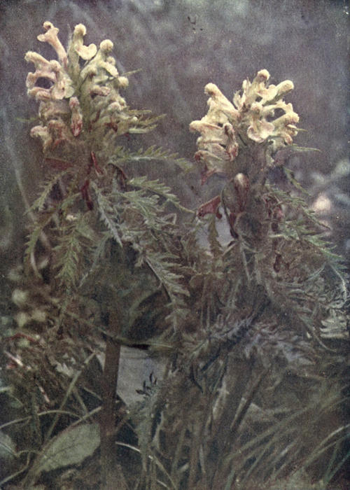 The Leafy Lousewort here illustrated is the commonest variety in most districts. It is a tall, stately plant, often some two feet high, which is found on grassy slopes and in rocky places between 3500 and 7000 feet, and grows best on a limestone soil. The large fine-divided leaves are even found among the pale yellow flowers on the flower-stem. The plant flowers in June and July, and is found in the Alps, Pyrenees, Vosges, and Jura. It will be readily recognised by its alternate leaves, and pale yellow hairy flowers, without any beak-like projection at their summits. Pedicularis Oederi, which is a little like it, has no foliage leaves between the flowers, which are devoid of hairs, and have a blackish red spot on either side of the upper lip.