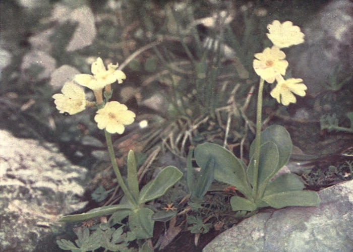 Directly the snow melts up come the Auriculas, but only on limestone soil. The Auricula is really a spring plant, and usually flowers in May, but where protected by slowly melting masses of snow it may not bloom till much later; the accompanying photograph was taken in July. The thick, dense rootstock penetrates deep into the clefts of the rock. The leaves are smooth, rather fleshy, and of a bluish-green colour. The upper surface of the leaves, the flower-stalk and the calyx are covered with a white mealy substance. The leaves appear to serve the plant as a means of absorbing or storing water. Although the thick, dense cuticle usually present on leaves which have this function is here absent, they are found to dry up very slowly. It is probable that the thick cellulose walls between the individual cells replace the cuticle in the leaves of this plant. The flowers give forth a pleasant odour, something like that of the cowslip, but rather sweeter. Like the flowers of the primrose, they are of two kinds. The one has a long stigma which projects as far as the opening of the flower, and short stamens, and the converse is the case in the other. The object of this arrangement is to facilitate the pollination of the flowers by the agency of insect visitors as they pass from the one type to the other. Darwin found that very few seeds were formed when the flowers were self-fertilised.