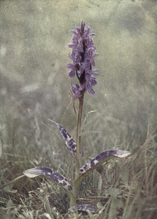 Of the genus Orchis alone there are no less than seventeen Swiss species. Many of these are much alike, and by no means easy to distinguish from one another. One of the most abundant is the Marsh Orchis, which is also met with in England, but is not nearly so common there. The plant grows in damp meadows and boggy places, where an average sized plant may be 18 inches or two feet high. Its large purple spotted flowers appear in June and may last until July.