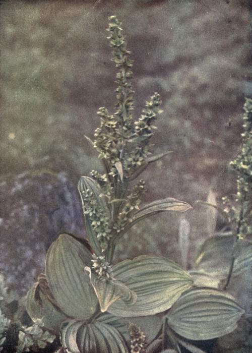 The White Veratrum is a tall weed with large green leaves, very abundant in moist meadows and pastures in all parts of the Alps between 2000 and 6000 feet. Before the flowers appear it strongly suggests one of the larger Gentians, but the flowers, which come out in July and August, are quite different. It is a widely distributed plant, being found in Russia, Siberia, Lapland, as well as in most of the mountain ranges of Central and Southern Europe. It appears to have been left as a relic of the glacial period in the higher parts of Silesia and the Black Forest. The large green leaves are downy beneath, and the flowers, which are always green externally, may be pure white (var. typicum), or more commonly yellowish-green (var. Lobelianum), internally. Some would regard these two varieties as distinct species. The whole plant is extremely poisonous. Sometimes it is eaten by the sheep and goats with disastrous results to the herdsmen, but the cattle are wiser and rarely make this mistake. The poison is an alkaloid Veratrin, which is contained in largest quantities in the root from which it is extracted for medical purposes. If the root be tasted it will at first appear sweet, but its acrid, bitter flavour soon overpowers this first impression. The Swiss herdsmen look upon the White Veratrum as a noxious weed, not only because of its poisonous[79] properties but also because it grows in the richest soil and robs the true fodder plants of nourishment. In the Jura, on the other hand, the farmers rather welcome it. They say that the shade of its large leaves preserves the grass for the cattle and prevents it becoming dried up by the scorching sun.