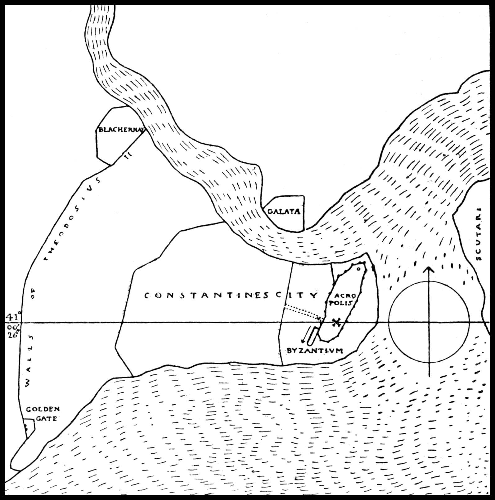 An extremely valuable description of ancient Byzantium and[Pg 5] the reconstruction by Constantine is given by Zosimus, writing not much more than a century after the transformation. “Now the city lay upon the crest of a hill which forms a part of the isthmus that is made by what is called the ‘Horn’ (κέρας) and the Propontis. And formerly it had its gate (πύλη) at the end of the colonnades which Severus built.” ... “And the wall on its western part descending along with the crest reached to the temple of Aphrodite, and the sea of Chrysopolis [Scutari] which is opposite; and in the same way from the crest the wall descended northward to the harbour which is called Neorion, and from thence up to the sea which lies directly in front of the straits through which one enters the Euxine.” ... “This then was the ancient size of the city. And Constantine erected a circular forum where formerly was the gate, and surrounded it with porticoes of two storeys. He set up two very big arches of Proconnesian marble opposite each other; through them one entered the porticoes of Severus or issued from the ancient city. And wishing to make the city much larger he further continued the old wall fifteen stadia, and inclosed the city with a wall which cut off the isthmus from sea to sea.”