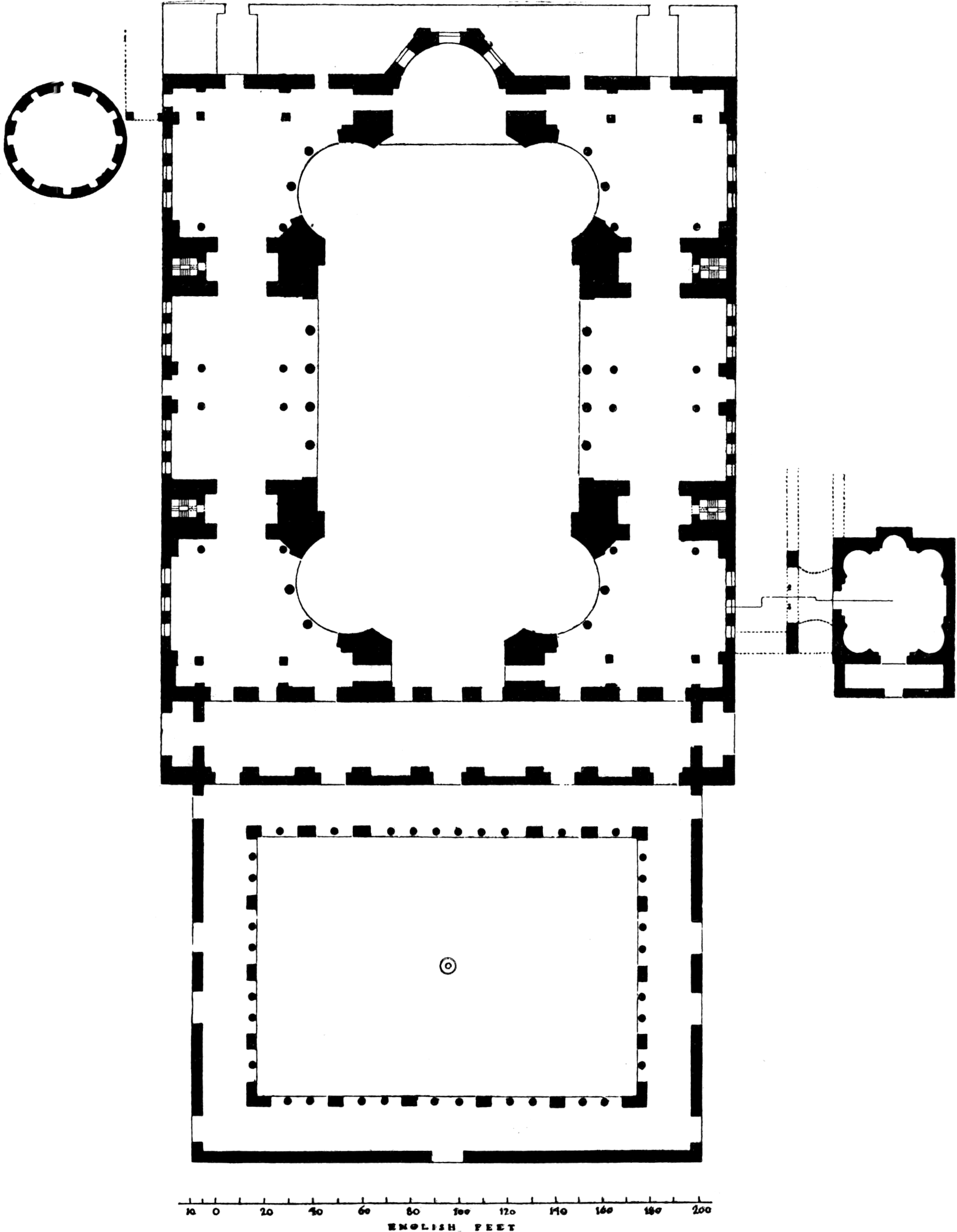 [341] There is no doubt about these arches being truly pointed. They were drawn so by Dr. Covel about 1675, they appear so in the careful engraving in Miss Pardoe’s Bosphorus, and these are fully confirmed by Strzygowski and Forchheimer, Die Wasserbehälter von Konstantinopel, pp. 12 and 71. The use of the pointed arch in the east is probably an unbroken tradition from early days in Egypt.