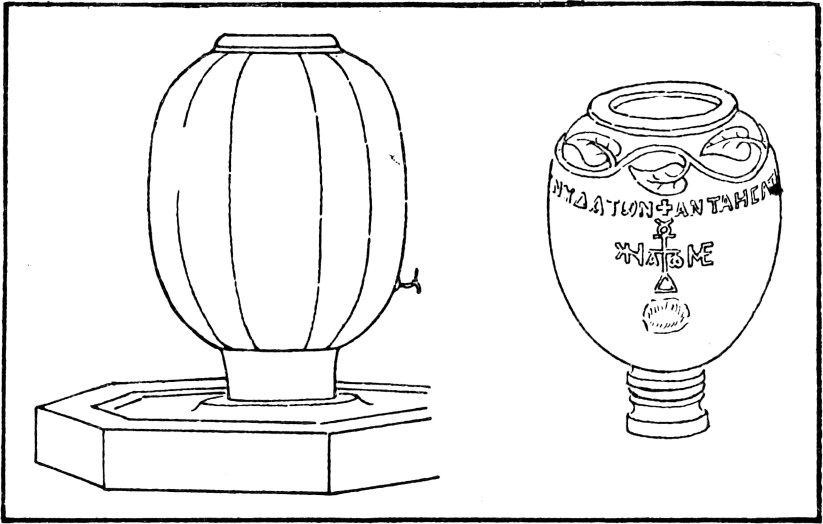 CHAPTER V. Main Divisions. Bema. Altar. Ciborium. Crowns, &c. Altar Veils. Iconostasis. Prothesis and Diakonikon. Holy Well and Metatorion. Solea. The Nave and Pavement. Font. Crosses. Miraculous Marbles, &c. Water Vessels. Images and Tombs. Hangings. Carpets. Synods. Clergy and Ritual. Adoration of the Cross. Procession to the Church. page 66