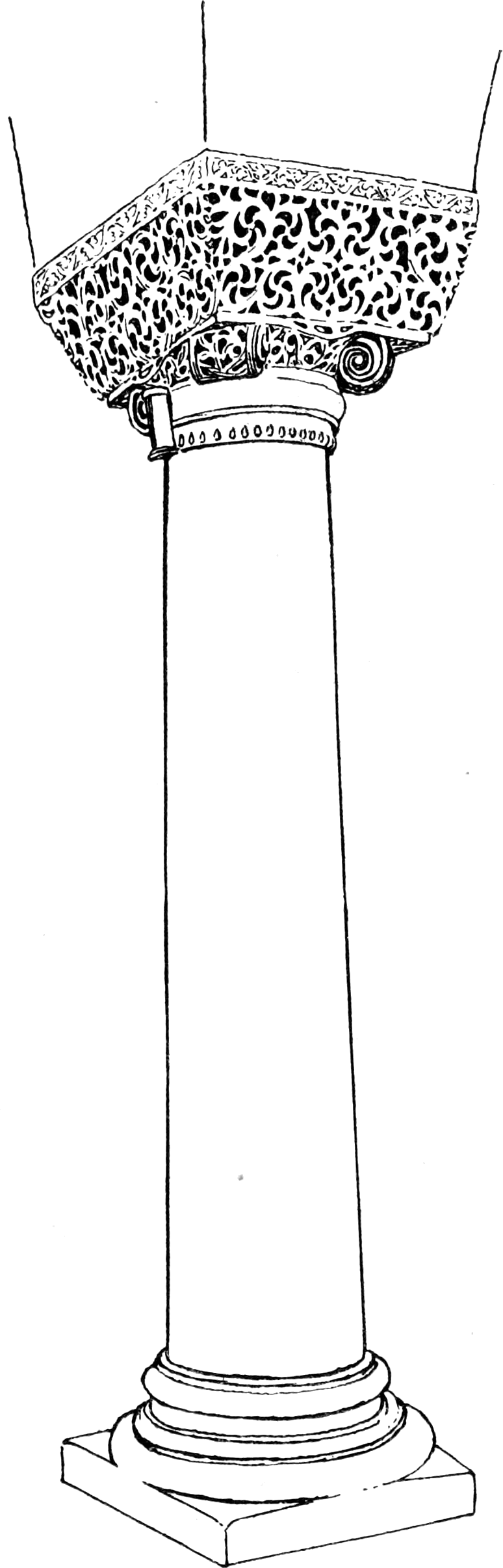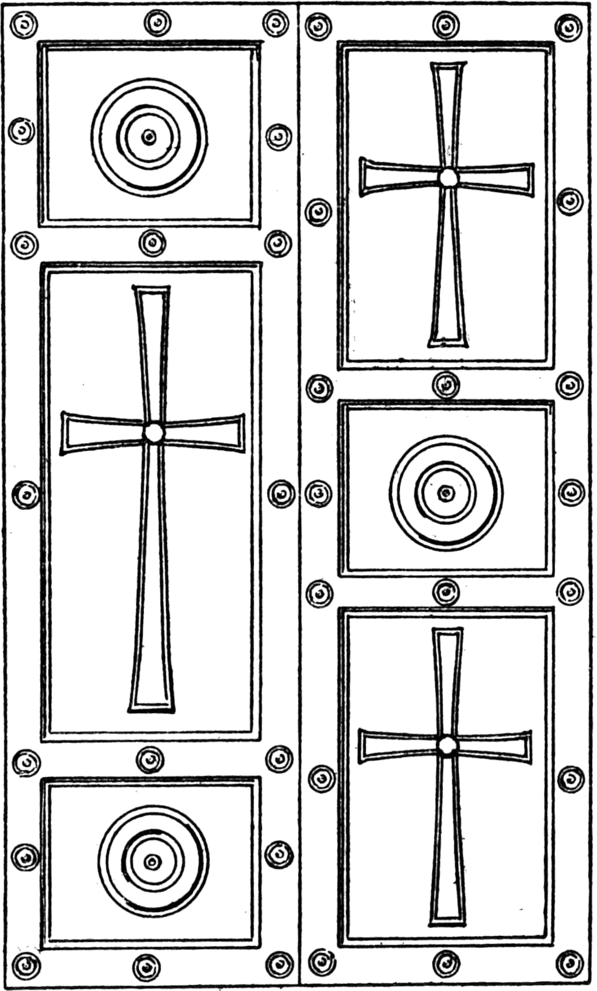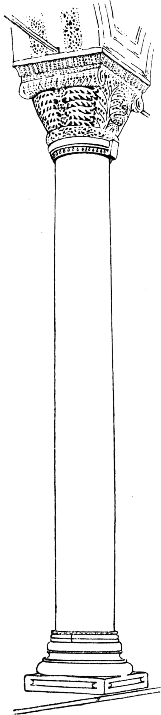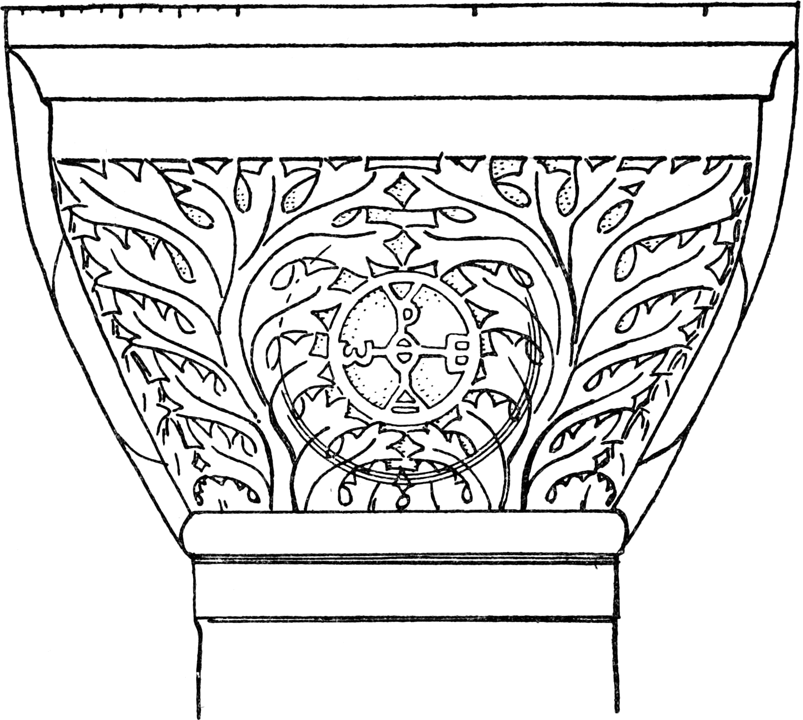 We very probably have some relics of the earlier buildings in certain capitals which Salzenberg found in the church:[41] the inscribed bricks,[42] and a Byzantine Corinthian capital now lying in the courtyard, may likewise have belonged to it. The fine bronze doors to south porch are evidently earlier than the present church, and so probably are the slabs of which the screen on south side of first floor is partly made up.