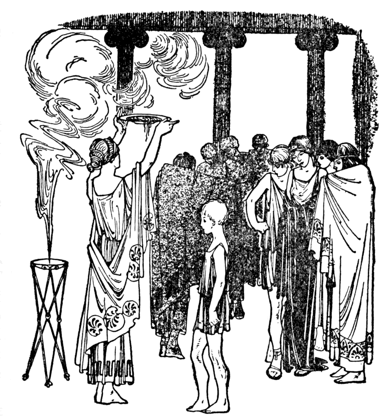 After this wonderful thing had happened, it seemed almost impossible that there should be any greater excitement in store. Yet when, preceded by heralds blowing trumpets, the successful athletes marched round the stadium and the air rang with the shouting and applause of the multitude, it seemed that this, after all, was the greatest moment of the day. It was difficult to decide which of the two brothers, Phidolas or Agis, was received with the wildest enthusiasm. When Agis was crowned, the people roared their applause because of his youth (and, indeed, as he followed the heralds he looked a charming, but very little boy). And when Phidolas, in his turn, rode round the stadium, the people were again worked up to a frenzy of delight, and Aura, as though she knew that part of the applause was meant for her, stepped proudly, and arched her glossy neck, while her beautiful dark eyes thanked the people for praising her.