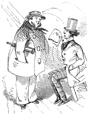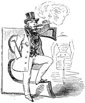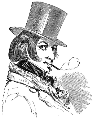 The first Gent we ever saw, we encountered on the roof of an omnibus, with his hat a little on one side, and a staring shawl round his 5neck. He was also smoking a cigar, as he sat next to the driver, in order that he might reap the benefit of his anecdotes and remarks concerning the horses and vehicle, to which the Gent replied at intervals, “Ah,” and “Yes,” and “I should say not,” and “Just so,” with other similar phrases used to fill up unmeaning dialogue. We heard him speak of “a Party he knew,” and he was very much interested at hearing that the off-horse worked “in the fust bus as ever Shillibeer started, and was took from the Angel to be put on the Elephant.” He was also informed of the singular speculation in which “the guvner give a fippun note for that little mare, and was offered eight sovrins for her within a week, though she was a reg’lar bag o’ bones;” upon which the Gent observed that “very often those sort of horses were the best.” Having delivered himself of which opinion, he rolled his cigar about in his mouth, gave a whiff in our face, and then 6removed it between his middle and ring-finger, to offer it to another Gent on the roof, who begged the favour of a light.