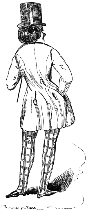 The next Gent we met was in the street. He wore large check trowsers of the true light comedian pattern, which appeared to have been made expressly for Mr. Walter Lacy, or Mr. Wright: and he had on a short odd coat; such a one as that in which Mr. Buckstone might be expected to go to a ball. He carried a little stick of no earthly use, with a horse’s silver hoof on the top of it, which he kept to his lips always; and he also patronised the staring shawl and cigar; and he evidently imagined that he was “rather the Stilton than otherwise”—“Stilton” or “cheese” being terms by which Gents imply style or fashion. He was pursuing a pretty girl of modest deportment, who was possibly going home—for it was evening, when Gents and cheap umbrellas chiefly flourish—after her hard day’s toil at a bonnet-shop. The Gent 7had not the sense to see that his advances were repulsed with scorn and indignation. He 8imagined that by addressing his coarse annoying gallantry to an unprotected girl, he was acting as if he was “upon town,” “a fast man,” “up to a thing or two,” or some other such epithet, which it is the ambition of the Gent to get attached to his name.