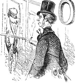 We met the next Gent in the boxes at one of the theatres, whither he had come in the full-dress of a light blue stock, and cleaned white gloves re-dirtied. We knew they had been cleaned; they exhaled a faint camphine odour, as he put his hand on the brass rail and leant over us, and there was none of that sharpness of outline in their dirt which new gloves evince: it was denser, cloudier, more universal; and the knuckles and nails were remarkably so. This Gent also had a little stick. He lighted a cigar at the lobby-lamp on leaving the house, and pulled a staring shawl out of his hat as he whistled an air from one of the burlesques. He went over to the Albion, 9the room of which was quite full; and after standing in the centre for a few seconds—tapping 10his teeth with his stick, whilst his left hand was thrust into the hinder pocket of his coat, dragged round to his hip—apparently disgusted at not creating any sensation, he turned round on his heel, and crossing Covent Garden, ultimately dived into Evans’s.
