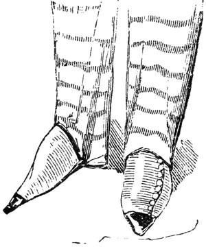 To his taste does the ready-made Shoemaker appeal in the short fancy Alberts, ticketed “The Fashion.” If you are accustomed to derive a little gratuitous amusement from shop windows, as you go along the streets, you will see in them the funniest things, meant for the Gents, that it is possible to conceive. The most favourite style of chaussure is a species of cloth-boot, with a shiny-leather toe, and 18a close row of little mother-of-pearl shirt-buttons down the front; not for any purpose, for they are simply sewn on, the real method of fastening on the brodequin being by the humble lace and tag of domestic life, at the side.