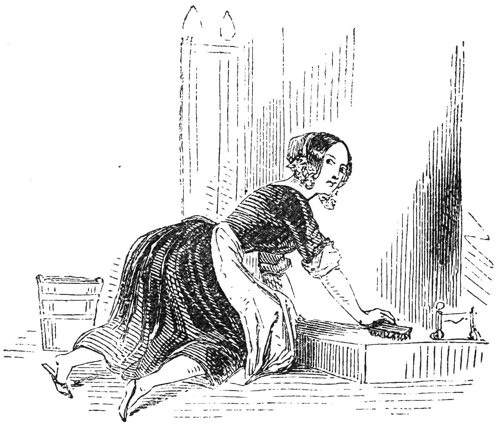 It is for the Gents to buy, that the print-sellers put forward those dreary pictures of the Pets of the Ballet; consisting chiefly of chubby young persons, in short petticoats and ungraceful attitudes, like nothing ever seen on the 22stage anywhere; and coloured lithographs of housemaids cleaning steps; and chambermaids with flat candlesticks in their hands; and women with large black dots of eyes and heavy ringlets, trying on shoes. One was very popular a little time ago. It represented a young lady something between a hairdresser’s dummy and a barmaid, with a man’s coat and hat on over her own dress. She was looking through 23an eye-glass at the top of a whip, and underneath was written “damme!”—why, or wherefore, or in what relation to the singular mode of toilet she has adopted, or what the word itself meant in the abstract, we never could make out. But the Gents seemed to know all about it, and bought the picture furiously.