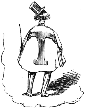 For him the cheap Tailor announces the “Gent’s Vest”—which is the Hebrew for “Snob’s Waistcoat”—as patronised by the nobility. To catch his eye alone, are the representations of men of ton put at the side of the advertisements; and, for his inspection, do the dummies stand at the doors of the shops, invested in the splendour of an entire suit, with an impossible waist, “made to measure for the same terms.”