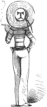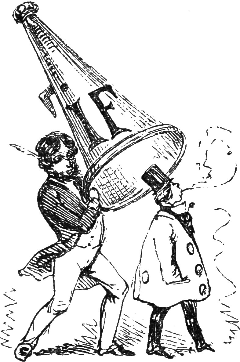 We think it would be an excellent plan for respectable electors to make members pledge themselves to vote for the heavy taxation of various articles in which Gents chiefly delight. In this tariff we would have blue stocks; large breast-pins; snaffle coat-studs; curled hair; collar-galled hacks; Spanish dances; Cellarius waltzes; Caledonian quadrilles; lithographed beauties, plain and coloured; cheap cigars; large pattern trowsers; gay under-waistcoats or “vests;” thick sticks; short canes; walking-whips; and boxes of omnibuses, as distinguished 100from omnibus boxes. If the Gents could not enjoy these things without paying heavy prices for them they would go without; for a great effect at a small outlay is the main intention of all their follies.