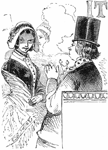 The presiding goddess of this temple of smoke is a scantily educated woman, who has 93been more or less pretty at some time or another; but still retains, it would seem, sufficient attraction to draw the Gents about her. Here they will pass hours, finding intense pleasure in her commonplace uninteresting conversation—retailing dull jokes, worn-out anecdotes, or vapid inevitable puns to each other; and staring at any casual purchaser who may enter the shop, as if he were an intruder on their domain.
