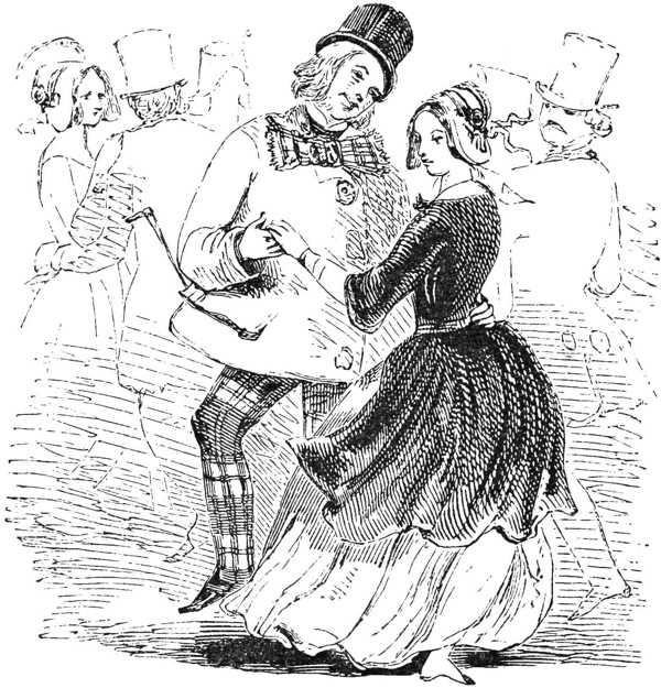 Very opposite to him is the joyous Gent, whom we may term the Perrot of private life. He always gives us the notion of a ballet-dancer spoiled, especially in Pastorale or the Polka; in which latter dance, if he does not happen to have for his partner a young lady of determined spirit, and a keen discrimination of right and wrong, he will launch off into all sorts of toe-and-heel 54tomfooleries, such as simple people used to perpetrate when the Polka first broke out—such as you may still see, after supper, at Jullien’s and Vauxhall, or at the “Gothics,” and other ten-and-sixpenny demi-public hops, of the same genus, even at the Hanover Square Rooms. The joyous Gent is very great indeed in cheap dancing-academy figures. He knows the “Caledonians” and the “Lancers;” he loves the “Spanish dance,” and patronises the gloomy, and almost extinct “Cellarius.” And we will make any reasonable wager, that before the quadrille begins, he will bow to his partner, and then to the corner lady, or the one on his left.