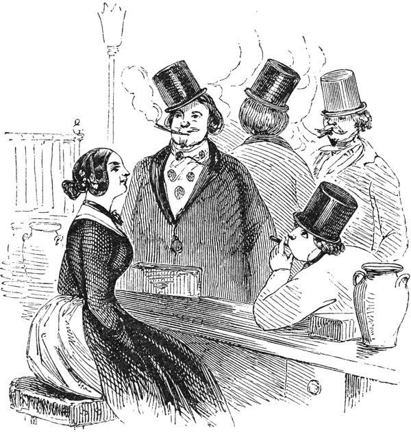 There is a peculiar race of Gents to be seen, through the windows, lounging in tobacco-shops; some leaning against the counter, others seated on tubs, or occupying the like 92positions. This employment is another variety of what Gents think “fast.”