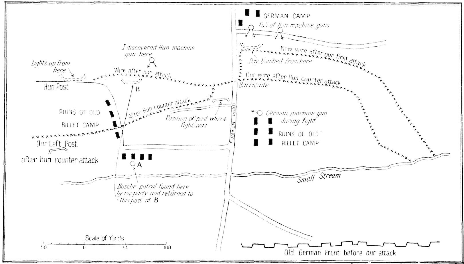 May 30. Tried the front line again, but Fritz knows we are there and shelled us out with low-bursting shrapnel—nasty stuff! After the men had withdrawn I went back to see all clear and was damn nearly hit by a whizz-bang. It burst in a pile of bricks about six paces away. I heard the explosion, and on looking up saw a column of bricks and debris just starting on its 29downward journey again. It rattled all over my tin hat but I was otherwise untouched. Later on some shrapnel whizzed into the parapet at my feet and some more crashed through an old notice board by my head. Hadn’t a single casualty all morning. My luck is still miraculous and it seems to extend to the men. Bosche aeroplane came over in the afternoon and brought down three of our balloons in flames.