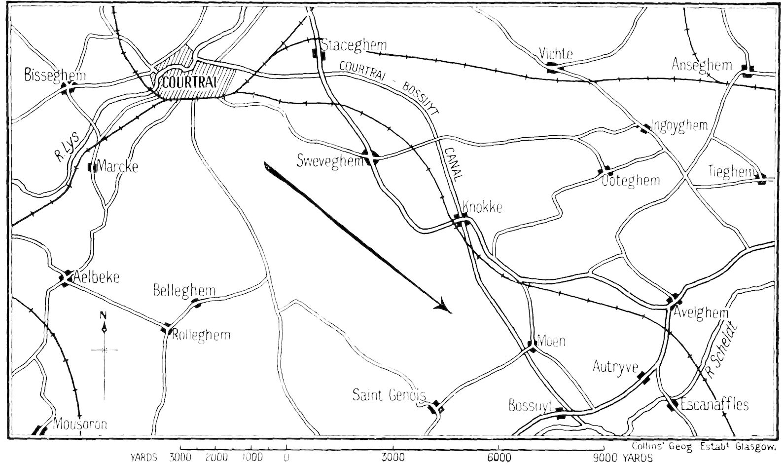 At 4.30 the attack on our left was resumed, and the Queens made a very gallant advance which brought them down almost as far as our left flank on the canal—unfortunately, 170there was no support, and before dusk the weary men had to retreat to their original positions.