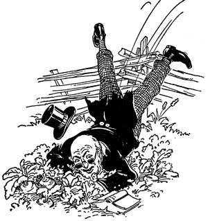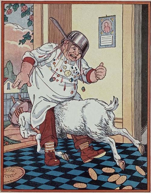 But oh my, how deadly tiresome it was to the poor performers and animals that had to take part! Billy and Nannie happened to be about the middle of the procession and as bad luck would have it, one of the clowns had selected just that place to walk. Billy was growing more desperate every block they went at not seeing a single[179] good chance to escape. For should he start to run away the clown would give the alarm and one of the guards of the procession in policeman’s uniform and mounted on horseback would give chase and capture him. Besides, he would have to butt his way through the crowds of people who were lining the sidewalks so closely it would be like butting through a stone wall.
