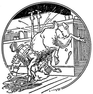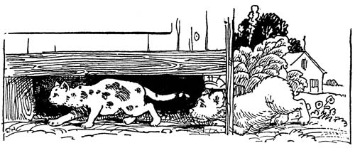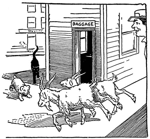 [14]And so it was decided that Billy, Stubby and Button should go through the town and Nannie around it, meeting them the next day at noon. But should they not appear by the day after she was either to wait for them another day or come back and find what had happened to them. So they all rubbed noses together, their way of kissing, and baaing, barking and meowing good-bys and wishing good luck to each other, they separated, Nannie going to the west to circle the town and Billy, Stubby and Button following the railroad that led through the center of the town.