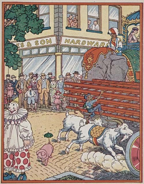 All the time the procession was making its way slowly through the streets the clown walked beside it talking to the crowds on the sidewalk. Oh, it was most exciting to the small boys and girls who never had seen a circus procession go by.