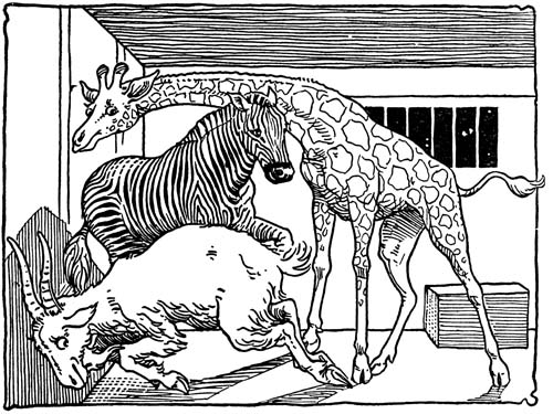 Just then the train gave a jerk that threw the zebra off its feet, bumped the giraffe’s head against the top of its cage and sent Billy’s head bang up against the end of his cage and Nannie’s short horns into his side.