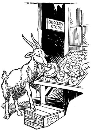 When they reached the corner where the alley crossed the street, they found a grocery store with baskets of vegetables and fruit displayed[182] outside. Billy took a peek and no one being in sight, he reached for a nice fresh cabbage and retired to the alley to eat it. Nannie did the same. Having finished the cabbage, they ate a bunch of carrots and were beginning on a head of lettuce when the grocery wagon drove into the alley and the driver chased them away with his long whip and then threw stones at them.