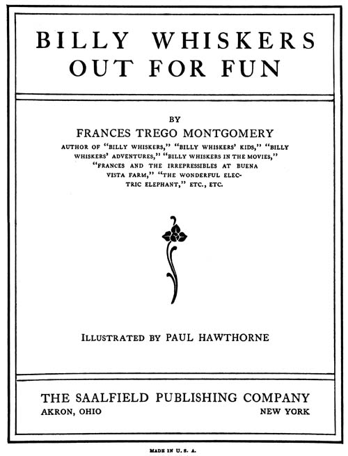 The antics of frolicsome Billy Whiskers, that adventuresome goat Mrs. Montgomery writes about in these stories make all the boys and girls chuckle—and every story that is issued about him is pronounced by them “better than the last.”