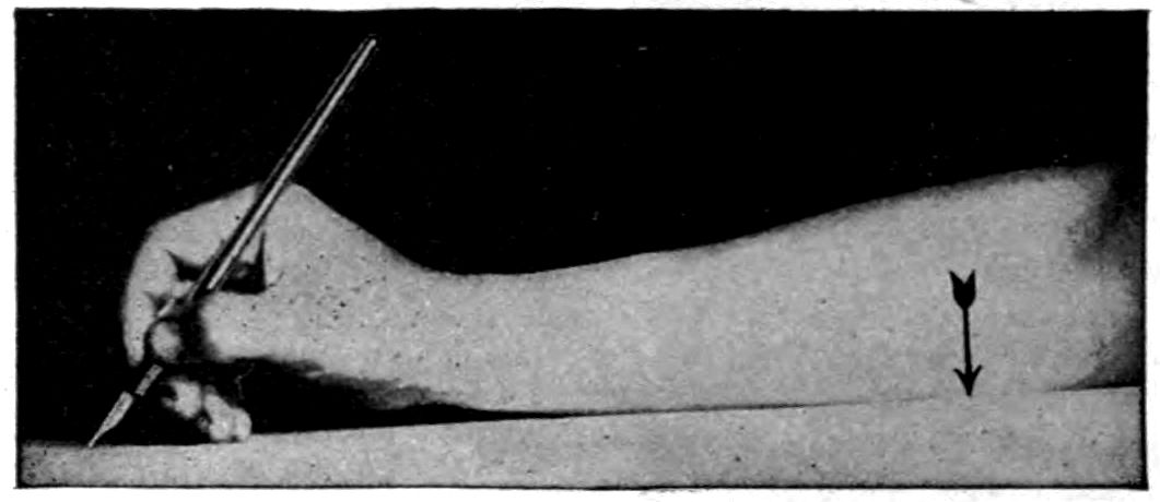 If the wrist or side of the hand rests on the paper, all motion coming from the muscles of the arm will stop at the wrist and it will be an impossibility to use muscular movement. Watch the wrist and the side of the hand closely. Remember that the propelling power is above the elbow, in the upper arm and shoulder.