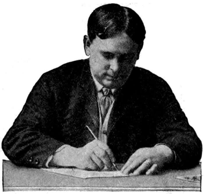 The first step is a correct understanding of the required position. Study the pictures on pages twelve, fourteen, and fifteen, of a pupil who has learned how to sit so as to use the large tireless muscles of his arms to the best possible advantage. Study every little detail of these pictures from the crown of the head to the shoes. Study particularly and closely the arms, the relation of one arm to the other, the position at the desk, the distance of the body from the desk, and the positions of the fingers preparatory to taking the penholder.