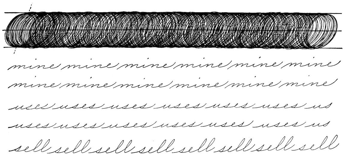 The copy-book has but one purpose—to secure absolute mechanical accuracy. The copy-book headline is usually first carefully penciled by a skilled penman after a given model, and shows none of the individuality of the penman employed in its construction. The penciled copy is given to a skilled script-engraver, who engraves it by hand and further perfects it wherever possible. This impossible and lifeless ideal the child is required to imitate through long, dreary pages of copying. No wonder he fails!