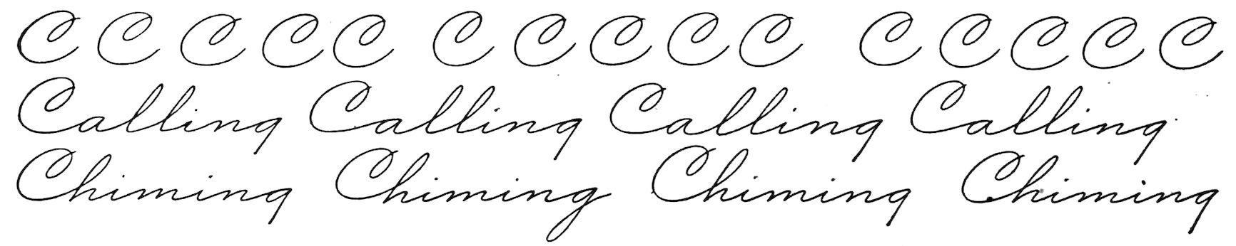 In the following copies the capital and word practice is intended to encourage free movement, continuity in execution, and better control of the writing muscles than has, perhaps, been gained. The plan is to repeat the capital until it can be made at the speed designated, and to follow with word practice. In the word drills the value of a continuous movement must not be lost sight of, and the pen should remain on the paper from the beginning to the ending of the small letters. In fact, all the copies should be treated as movement drills. Words ending in “ing” have been purposely selected and their value will not be questioned if they are rightly practiced.