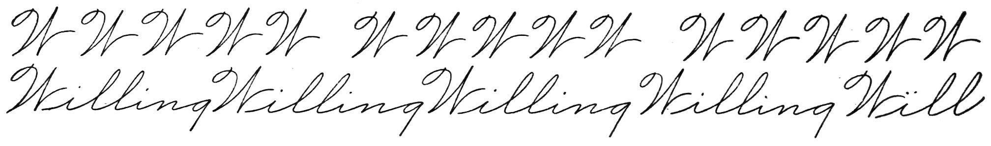 Capital W should be very closely studied. The tendency is to slant the last part too much, tipping it away from the first part. The upward stroke beginning the second part is a right curve, and the construction of the last part and the appearance of the entire letter are to a considerable extent dependent upon that line.