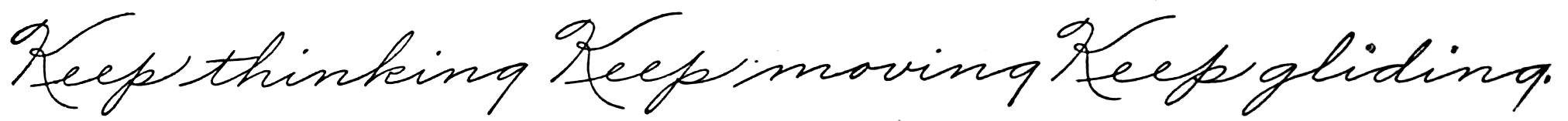 Forty capital K’s to the minute is a fair rate. Pupils should not lose sight of the fact that motion determines form. Take care of the motion and the forms of the letters will develop easily and naturally. A careful study of the movement as applied to capital K will be helpful. After making the first part of the letter, the hand (with the pen in the air) should swing below the base line, describing an oval and returning upward to the beginning point of the last part of the letter. Be sure to connect the parts with a loop, as shown in the copy. Drop the finishing part below the base line. Don’t forget the word practice; about twelve words to the minute is a fair rate of speed.