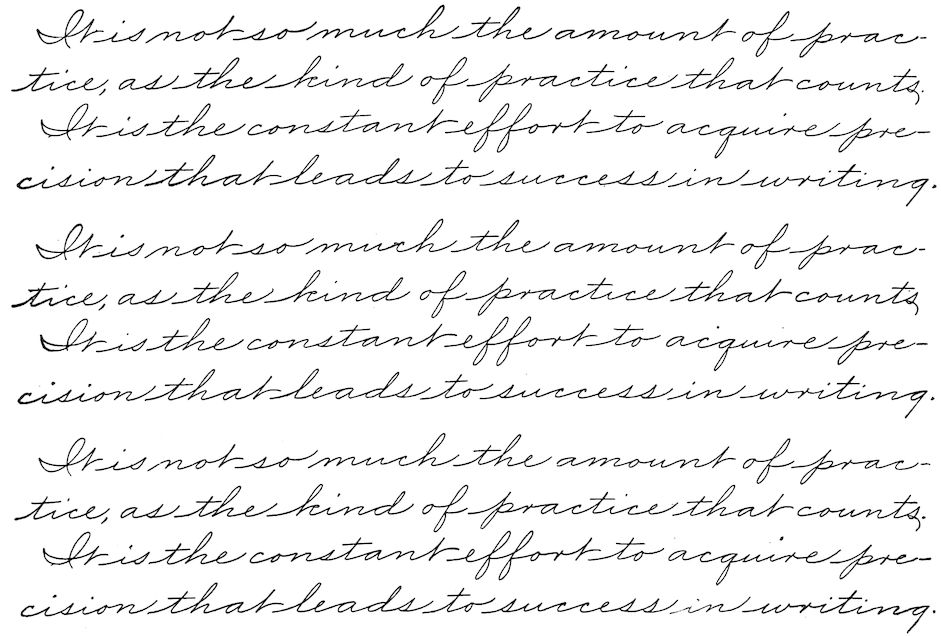 There is an old saying, “Practice makes perfect.” That is only partly true in relation to writing. Practice of the right kind leads toward perfection, but the wrong kind of practice leads just as surely in the opposite direction. It is not so much the exercise that is practiced as the manner in which it is practiced. Millions of pupils have wasted the time given to movement exercises because they thought it was the exercise that counted and not the manner in which it was made.