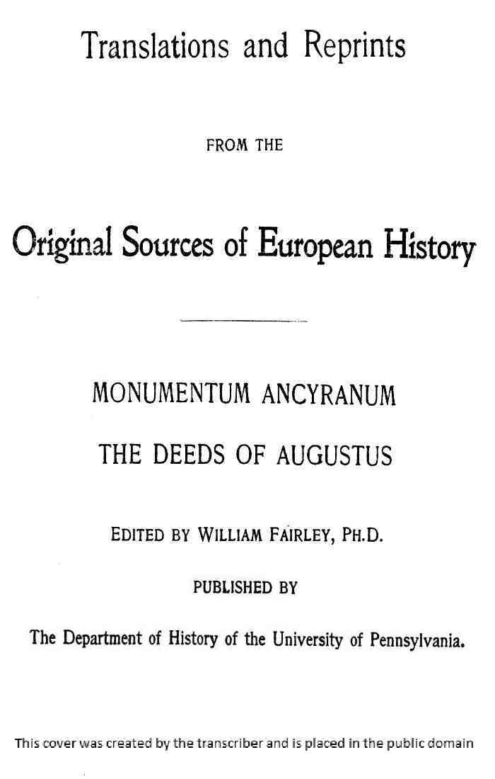 The method employed in this edition of the Monumentum Ancyranum is suggested by the purpose for which it is intended. That purpose is primarily to adapt it as one of the series of Translations and Reprints from the Original Sources of European History, published by the Department of History of the University of Pennsylvania. The English version is the core of the work. At the same time the opportunity has been seized to present the original texts in such form as to be of real philological service. That there is room for such an edition of the Monumentum Ancyranum there can be no doubt. The critical edition published by Mommsen in 1883, Res Gestæ Divi Augusti, must long remain for scholars the sufficient hand-book for the study of the greatest of inscriptions. But that edition, with its Latin notes, is not adapted for ordinary school or college use, or for historical study by those who do not readily use Latin. And although Roman histories constantly refer to this great source for the life and times of Augustus, there has been no accessible English translation. It is true that the English translation of Duruy’s History of Rome contains a version of the Monumentum, but it is not in full accord with the latest text as set forth by Mommsen, and is hidden away in the ponderous volumes of that expensive work.