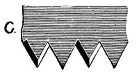 We will now consider the cross-cut saw tooth in regard to rake or pitch; this being one of the most important features, too much care cannot be taken to have the correct amount of pitch for the duty required. To illustrate this. Fig. 5 represents a board, across which we wish to make a deep mark or score with the point of a knife. Suppose [Pg 13] we hold the knife nearly perpendicular as at B; it is evident that it will push harder and will not cut as smoothly as if it were inclined forward as at A. It follows then that the cutting edge of a cross-cut saw should incline forward as at C, Fig. 6, rather than stand perpendicular as at D, Fig. 7.