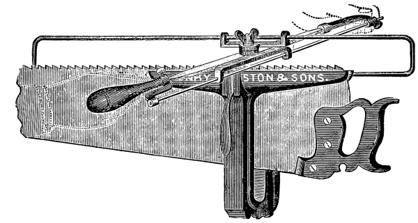 Too much hook or pitch and too heavy a set are very common faults, not only detrimental to good work but ruinous to the saw; in the first case, by having a large amount of pitch, the saw takes hold so keenly that frequently it “hangs up” suddenly in the thrust—the result, a kinked or broken blade; in the second, by having too much set, the strain caused by the additional and unnecessary amount of set is out of proportion to the strength of the blade, and it is broken in the same manner. The most general value of pitch used is 60 degrees, though this may be varied a little, more or less, to advantage, as occasion may demand.